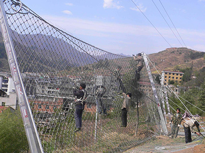 材质:钢丝绳网、支撑绳和减压环构造:由钢丝绳网或环形网(需拦截小块落石时附加一层铁丝格栅)、固定系统(锚杆、拦锚绳、基座和支撑绳)、减压环和钢柱四个主要部分构成。